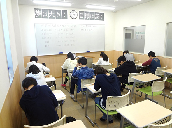 それぞれが自分の計画に合わせて講座受講や過去問演習に取り組んでいます。1,2年生も多数在籍しているため、定期テストシーズンでは自習の日を設けるなど、やるべきことを決めて日々の学習に取り組んでいます。