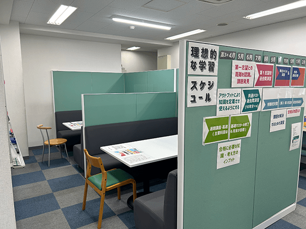 受付カウンター前。登校後、その日の学習について自分でスケジュール確認をし、担任助手からアドバイスを受けてから入室します。最近の学習上の悩み、学校で分からなかったことなどの質問対応も可能です。