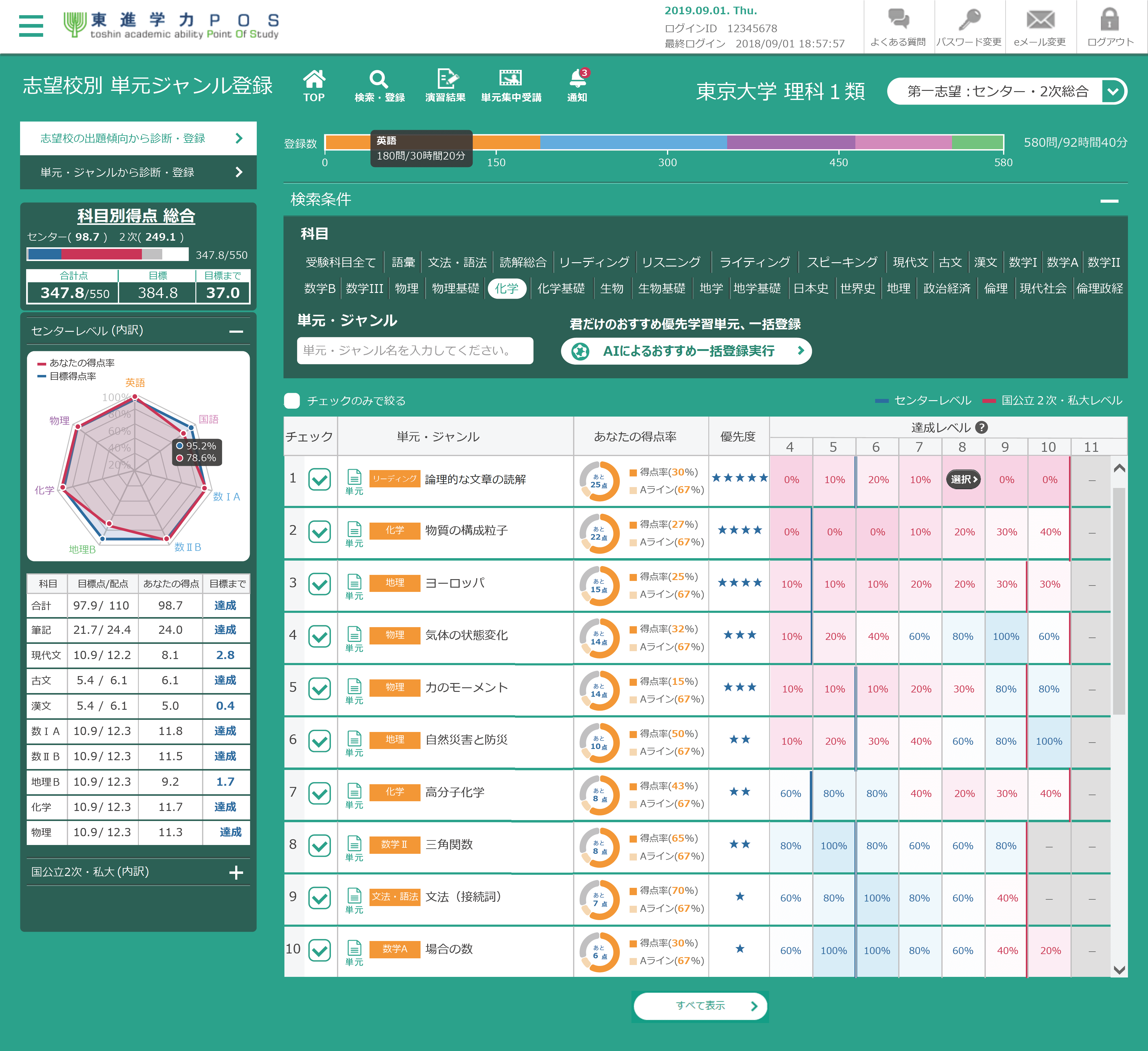 得点を飛躍的に高める方法、それは伸びしろが大きい苦手を克服することです。そこで、東進では苦手を徹底的に克服する講座を開発。この講座は、東進が保有するビッグデータとAIが融合した、一人ひとりに最適な志望校対策を実現する日本初の学習システムです。
